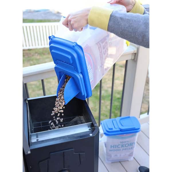 The Kingsford Wood Pellet Storage Dispenser provides the ultimate “store and pour” solution for wood pellets. Features include a pouring spout for neat and controlled hopper refills, strong carrying handles and a stackable lid design that enables space-saving storage of your smoker pellets. This unique, heavy duty storage dispenser holds up to 20 lb of wood pellets – which are easy to lift and pour thanks to the EZ Grip handle and EZ Pour spout. The slim container dimensions and stackable lid allows you to store several flavors of pellets while maximizing your tight storage space. The clear container walls allow you to monitor how may pellets you have left in the container, and you can use the included dry-erase label to identify the contents by type and/or flavor. (Markers not included). These dispensers also feature a unique “bag-gripper” lid element that allows you to store pellets inside (and pour pellets from) the original bag. Just place a 20 lb bag of pellets inside the container, scissor off the top, and replace the lid with the bag-gripper part tucked inside the cut-open bag top. Now you can pour pellets – fresh from the original bag!