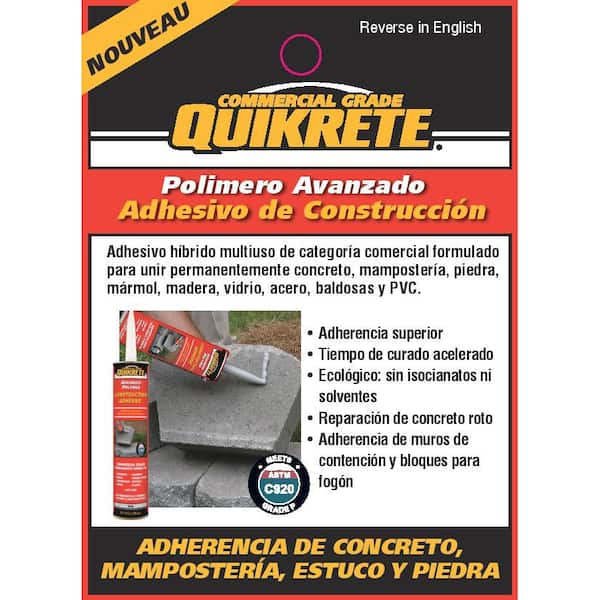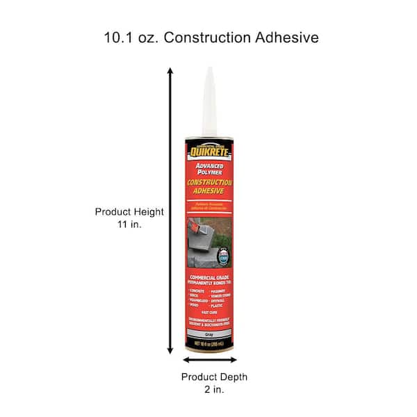 Quikrete 10 oz. Construction Adhesive is a high performance, construction grade adhesive for bonding a number of different materials. It is designed for permanently bonding concrete, brick, marble, stone, wood, glass, aluminum, steel, PVC and tile. Quikrete 10 oz. Construction Adhesive is typically used for repairing broken concrete, bonding wall blocks to caps, and attaching wood to concrete and masonry surfaces. Quikrete 10 oz. Construction Adhesive is easy to use, needing only a caulk gun for application.