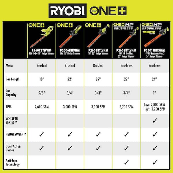 The RYOBI 18 in. 18V Cordless Hedge Trimmer is lightweight and compact at only 4.5 lbs. This hedge trimmer has a 5/8 in. cut capacity with dual action blades for reduced vibration. Part of the ONE+ system with over 300 tools and batteries and backed by a 3-year warranty. Battery and charger not included.