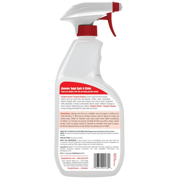 Simple Green Ready-To-Use Carpet Cleaner harnesses the natural power of peroxide to eliminate tough stains and stubborn dirt on carpets, rugs, fabric, and upholstery. This fast-acting cleaner lifts both new and set-in stains, removing soils and odors without harsh chemicals. It powers through grease and oils, food and beverage spills, pet stains, wine, coffee, and other tough stains. The easy-to-use spray and wipe formula requires no mixing and deodorizes as it cleans, leaving behind a fresh scent.