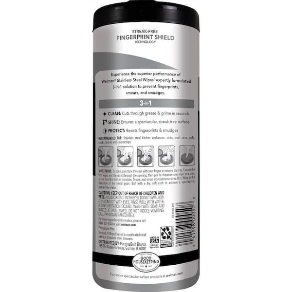 Give your appliances the showroom treatment with the convenient Weiman Stainless Steel Canister Wipes. A cleaning wipe designed with a polish that protects and resist fingerprints, watermarks and grease, while also repelling dust and dirt to keep your kitchen shining brighter and longer. Your stainless steel fridge, outdoor grill, dishwasher, washing machine, washer and dryer, microwave, cooktop, sink, faucet, and any metal or stainless-steel appliance surface will effortlessly convey a streak free, premium stain resistant and clean look. Weiman Stainless Steel Cleaner and Polishing Wipes help restaurants and commercial environments with the highest of expectations to look their very best (surfaces, refrigerator, and appliances). Weiman polishes, resists scratching, and resists staining with just a simple wipe and buff, then you’re done. Restore the brilliant look of your kitchen with our line of Weiman specialty cleaning products that compliment your wood floors, cooktops, granite surfaces, silverware and more. Weiman Products is the perfect home, chef, pro, scratch resistant, cleansing, household, professional, and at work solution for all of your stainless steel cleaning and buffing needs. The best specialty cleaning products you will buy online or in a store. When cleaning is your therapy, Weiman is your method, just wipe away and not a fingerprint in site.